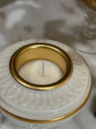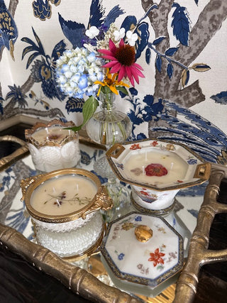 Each of our candles begins with an exquisite antique vessel - carefully sourced, steeped in history, and chosen for its character. We hand-pour clean-burning soy wax into these one-of-a-kind pieces, transforming them into luminous objects of beauty and function. Once the flame is gone, the story continues - reuse the vessel or return to us to be refilled